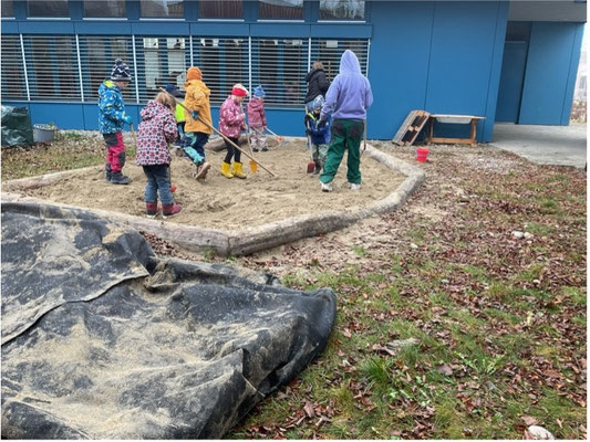 Wir haben dann bei Frau Setz vorbeigeschaut. Sie haben den Kindergarten Rot draussen aufgeräumt. Die Gruppe hat den Sandkasten begradigt und die Laubblätter zusammengewischt, dann haben sie noch das Unkraut rausgerissen.