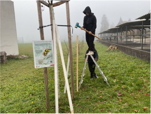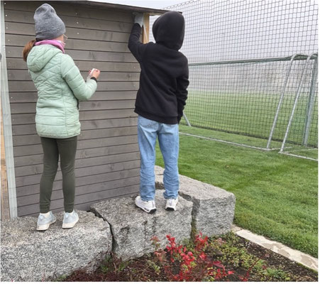 Herr Veil hat mit seiner Gruppe das Gartenhaus bemalt, er hat ein Insektenhaus Richtung Süden aufgehängt, weil die Sonne von Süden scheint, damit die Insekten genug Sonne bekommen.