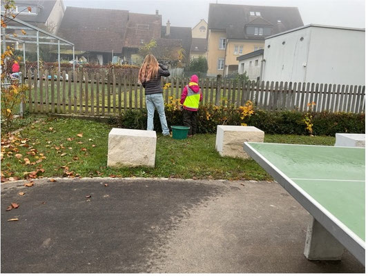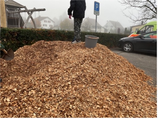 Nach dem sind wir zu Frau Stämpfli gegangen. Sie war mit ihrer Gruppe bei der Välkiburg. Die Kinder haben die Holzschnitzel in einem Eimer transportiert, um den Boden auszugleichen.